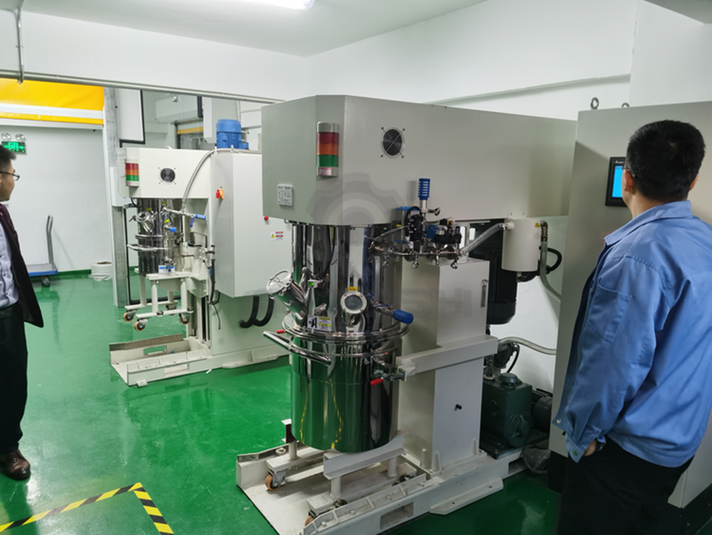 雙行星攪拌機雙行星混合機的攪拌槳葉,在公轉的同時也自轉,使罐體內物料上下及四周循環運動,從而可在很短時間內達到混合(混煉)效果。罐體內壁為大型立車精加工,再經大型拋光機自動 -